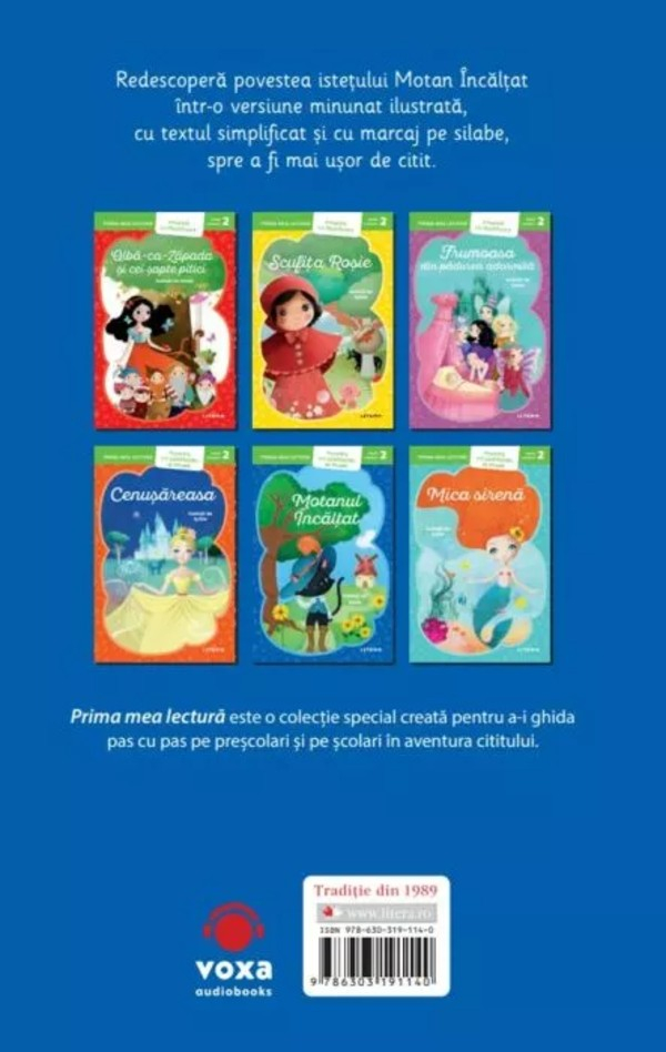 Redescoperă povestea istețului Motan Încălțat într-o versiune minunat ilustrată, cu textul simplificat și cu marcaj pe silabe, spre a fi mai ușor de citit.