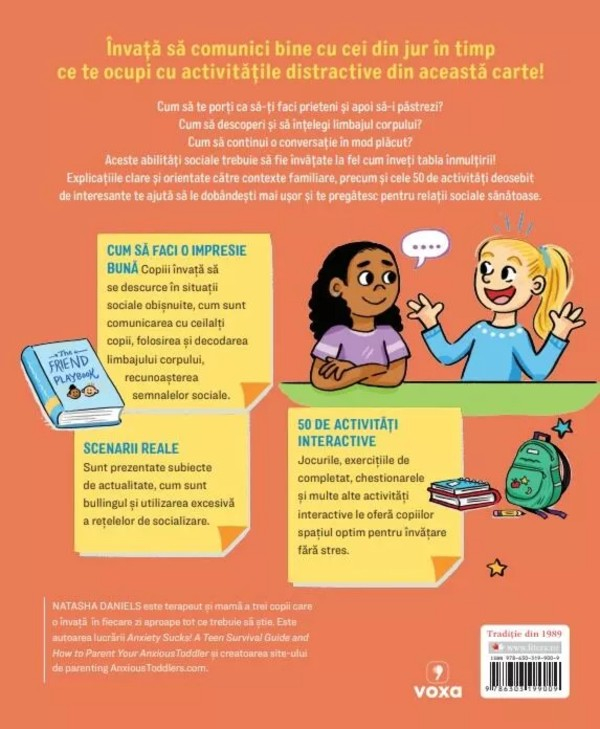 Cum să te porți ca să-ți faci prieteni și apoi să-i păstrezi? Cum să descoperi și să înțelegi limbajul corpului? Cum să continui o conversație în mod plăcut? Aceste abilități sociale trebuie să fie învățate la fel cum înveți tabla înmulțirii! Explicațiile clare și orientate către contexte familiare, precum și cele 50 de activități deosebit de interesante te ajută să le dobândești mai ușor și te pregătesc pentru relații sociale sănătoase.