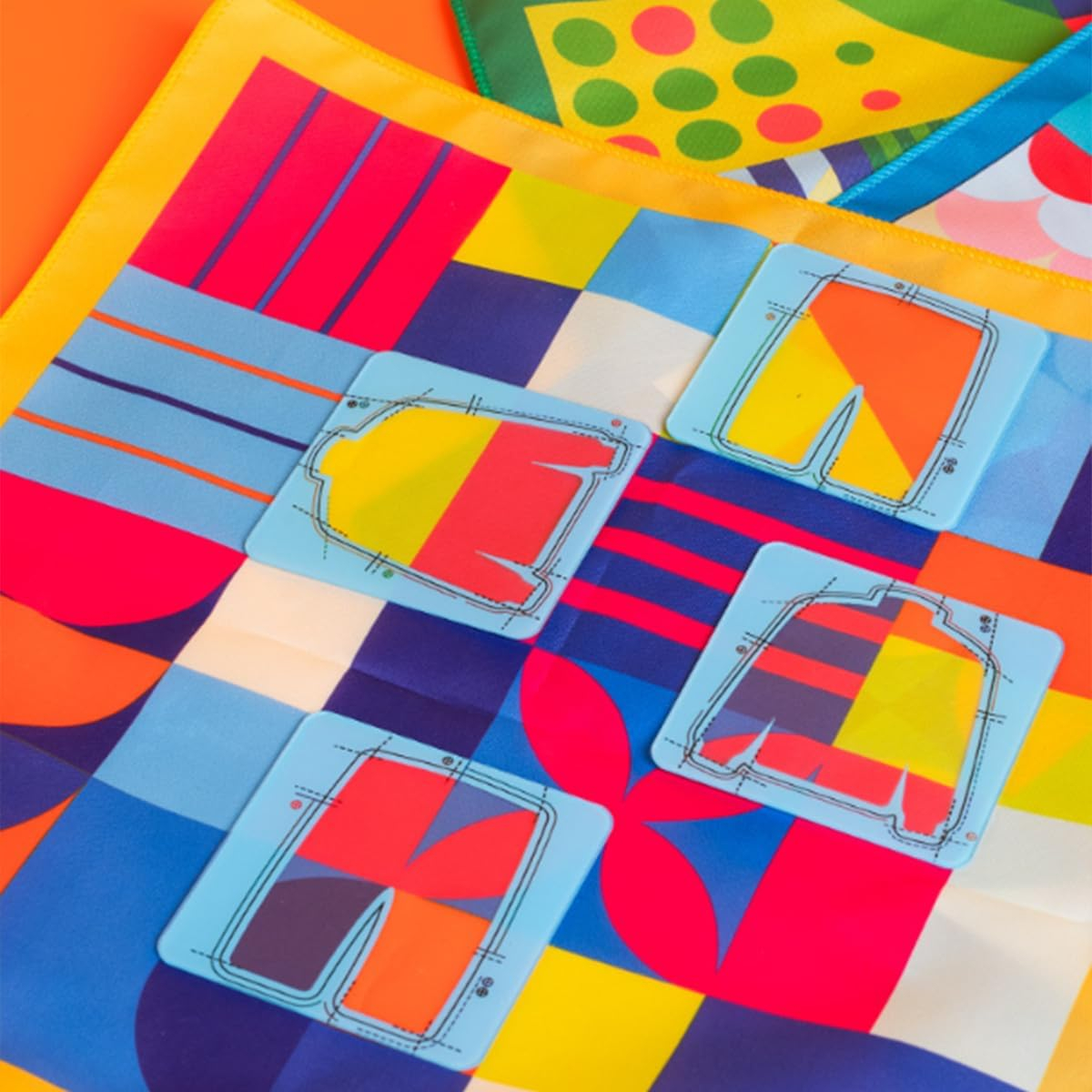- 2 bucati material identice, avand imprimate diferite imagini cu forme geometrice, colorate in culori vii