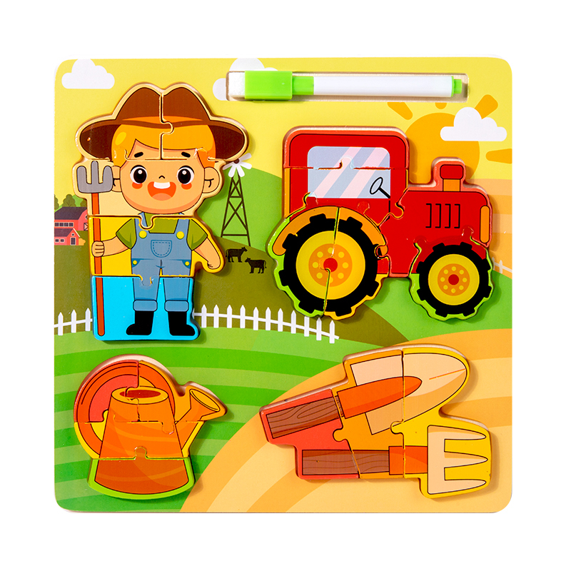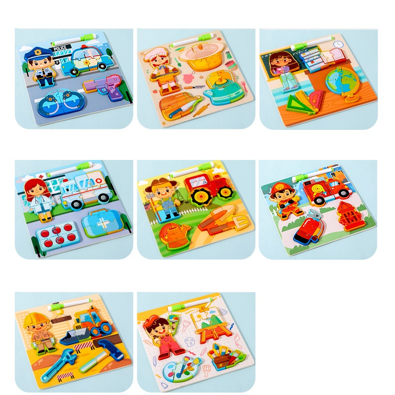- 18 piese de puzzle cu care cei mici vor reconstitui personaje reprezentand o anumita meserie cat si vehicule sau ustensile folosite in meseria lor