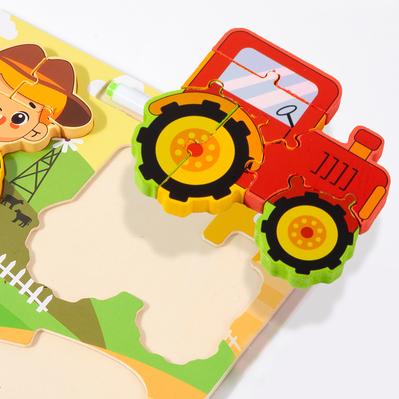 Spatele placii de puzzle, vopsit in alb, este special creat pentru a putea scrie si desena cu carioca lavabila ori de cate ori cei mici doresc. Placa se poate sterge cu un servetel umed, iar joaca se poate relua la nesfarsit.