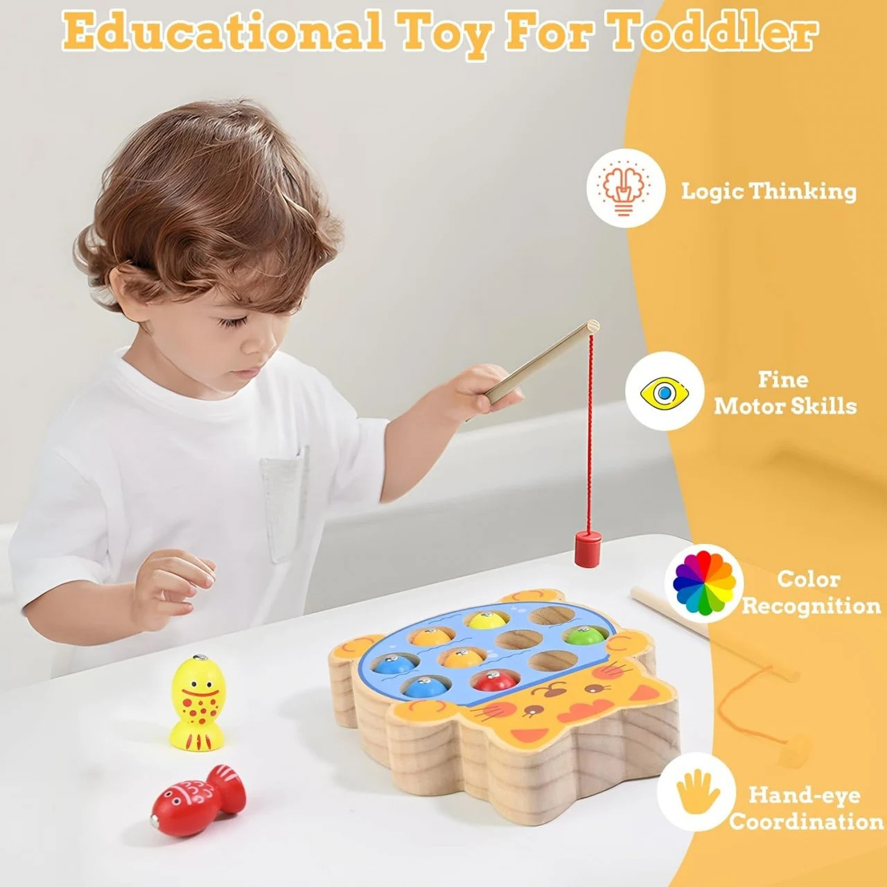 Cu ajutorul undițelor, cel mic va putea pescui peștișorii ascunși în orificiille lor.