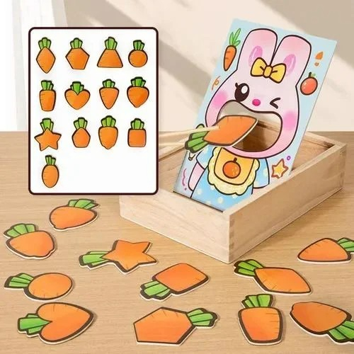 Piesele din lemn cu morcovi, vor putea fi utillizate si in alte jocuri si activitati de invatare, precum sortarea acestora pe categorii in functie de forma geometrica.