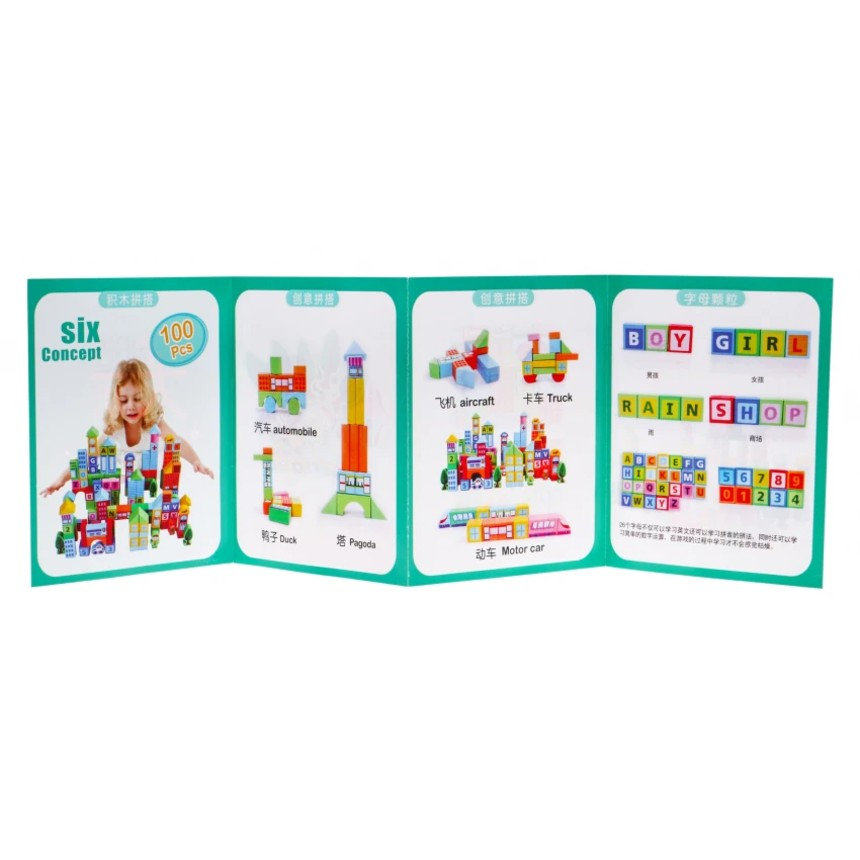 Setul conţine 100 de cuburi din lemn de diferie forme, marimi si culori, cu ajutorul carora cei mici isi vor putea construi propria ferma.